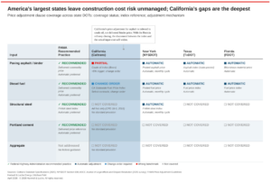 California is not uniquely deficient. Only 36 percent of state DOTs cover steel and 6 percent cover cement, but California is uniquely exposed because its infrastructure inputs carry premiums driven by fuel specifications, regulatory compliance costs and a contracting supply base that no other state faces at comparable scale. The national gap in steel and cement coverage is a problem everywhere. The indexing gap and the regulatory premium gap are California’s alone.