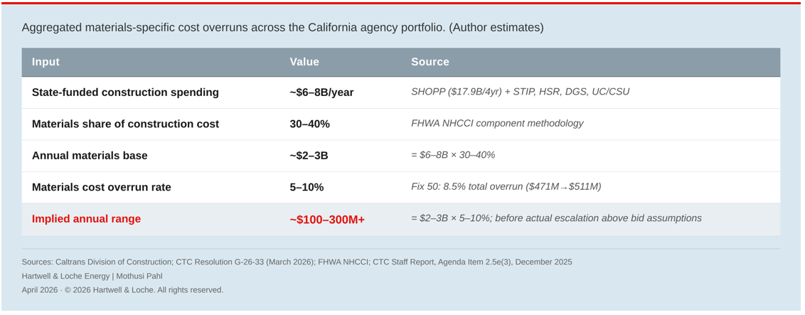 The aggregate statewide materials cost overruns across all infrastructure programs have never been aggregated and computed by any California agency. Caltrans tracks materials price levels through quarterly construction cost indices. DGS publishes the California Construction Cost Index. Project-level overruns are documented through individual supplemental funds requests. But no agency aggregates the materials-specific cost gap across the portfolio.