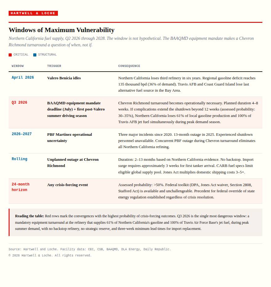 Without these measures, the sequence is not a managed decline. It is a Chevron Richmond crude unit failure, a Northern California fuel emergency that no state agency has the authority or inventory to resolve, failed JP8 delivery, and a federal response under Defense Production Act authorities that California cannot contest. The regulatory sovereignty California has spent half a century building will not survive that sequence.